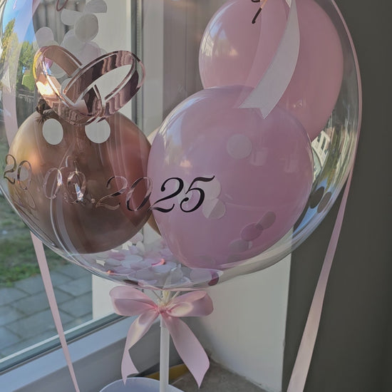 Ballons-Farbe Rosa Metallic(Andere Farbe möglich) Konfetti-Farbe Gemischt(Rosa,Weiss,Rosegold) Personalisierung/Wunschtext- Max.8 Wörter möglich Satinband- Rosa